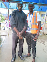 Tv.: En lille dreng ved indgangen til lufthavns-området. Børnene fik set de store flyvemaskiner i dag, som dagligt lander og letter fra Entebbe Lufthavn. Th.: Muliira fra UCC har mødt en bekendt blandt lufthavnspersonalet.